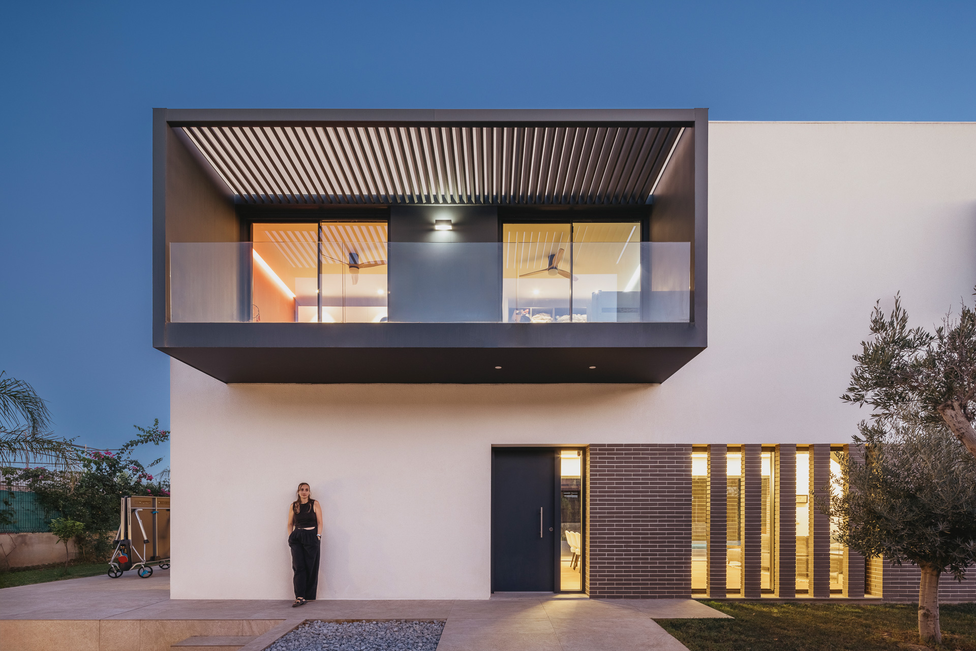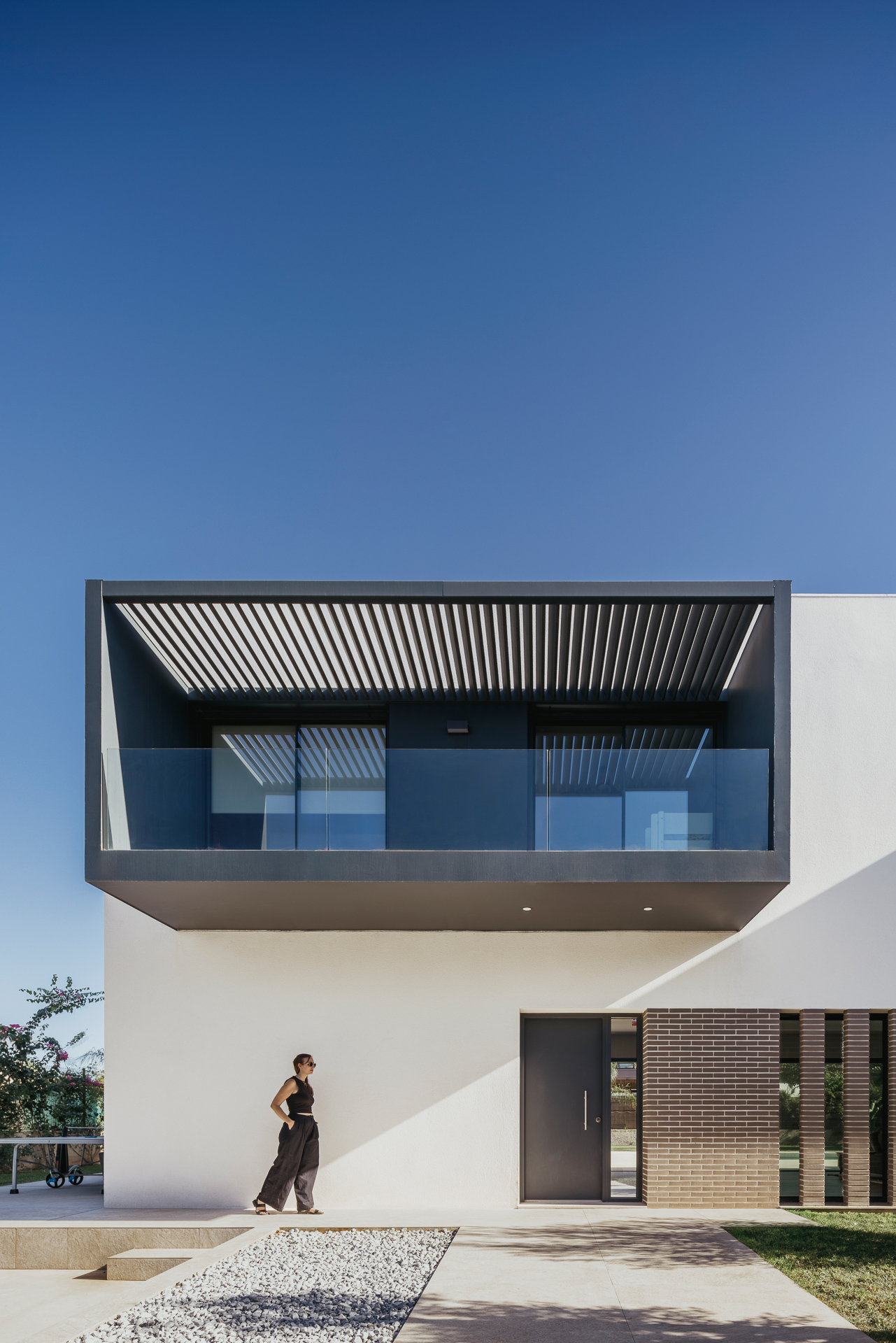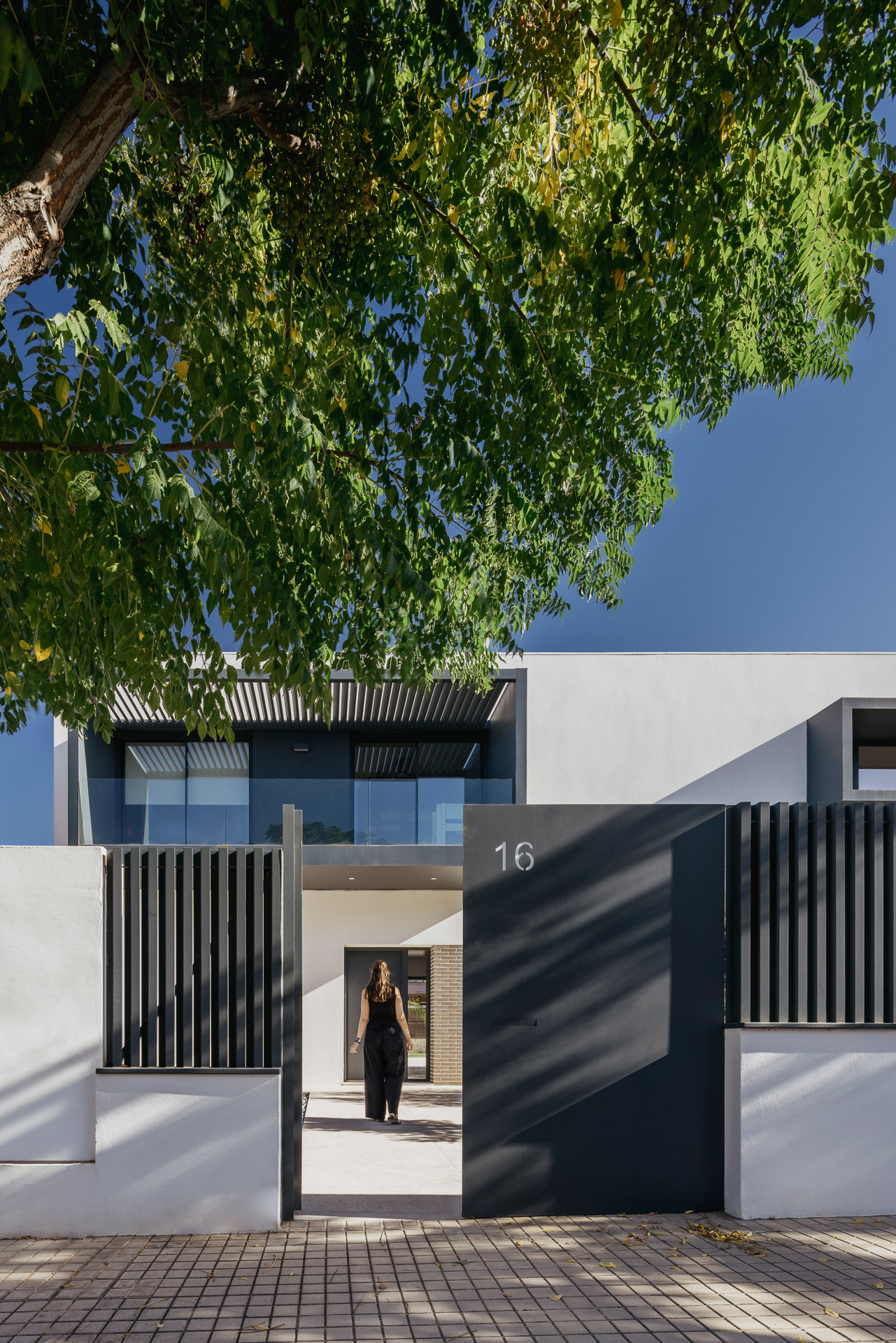 El proyecto se configura mediante dos volúmenes principales. El primero, de geometría rotunda y limpia, alberga el programa principal de la vivienda. En él, una franja de ladrillo visto gris abraza la planta baja aportando textura y privacidad mediante celosías, mientras que el resto de la fachada apuesta por la pureza del monocapa blanco. En la planta superior, dos cuerpos de aluminio gris antracita se proyectan hacia el exterior, subrayando los huecos que recaen a la calle.