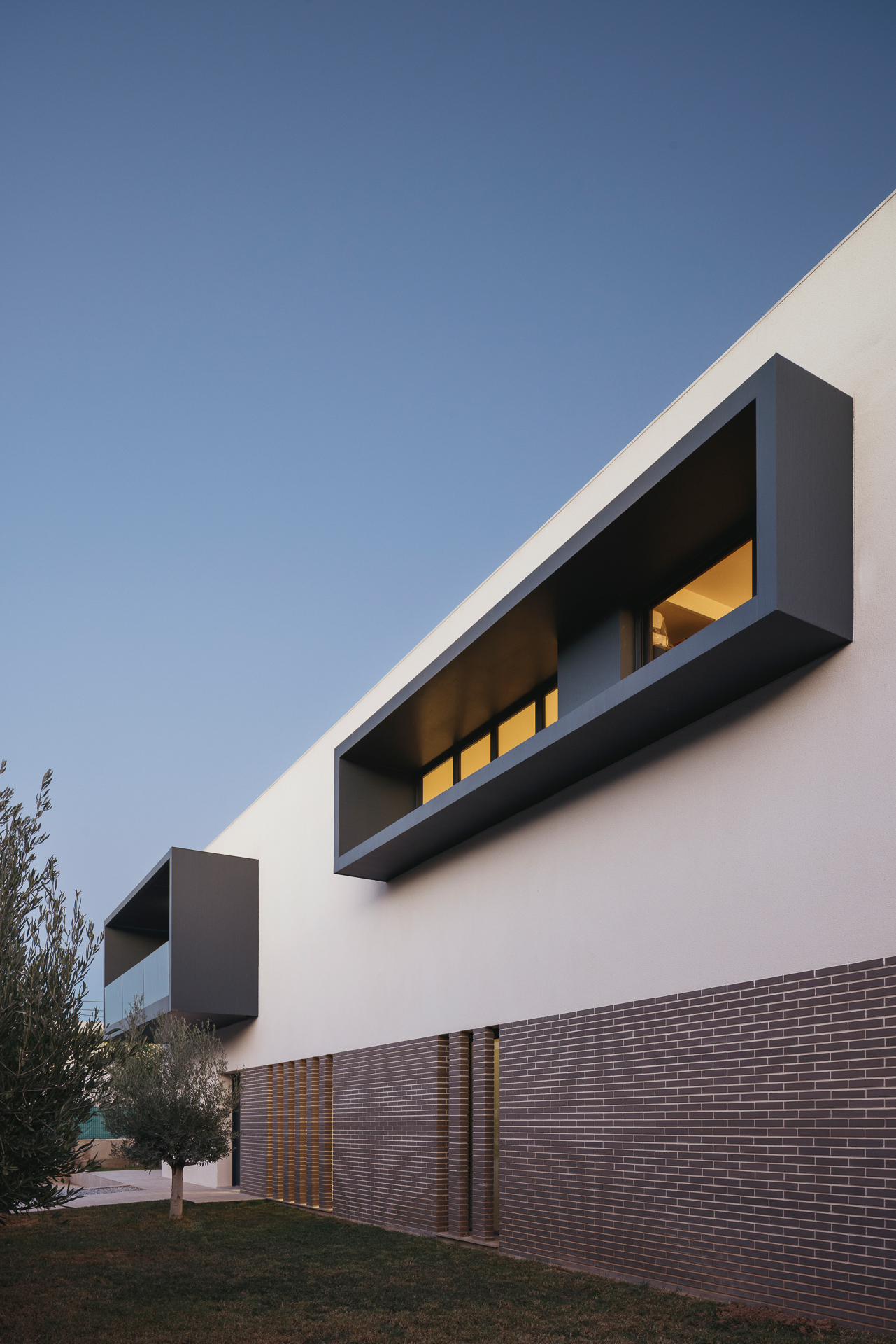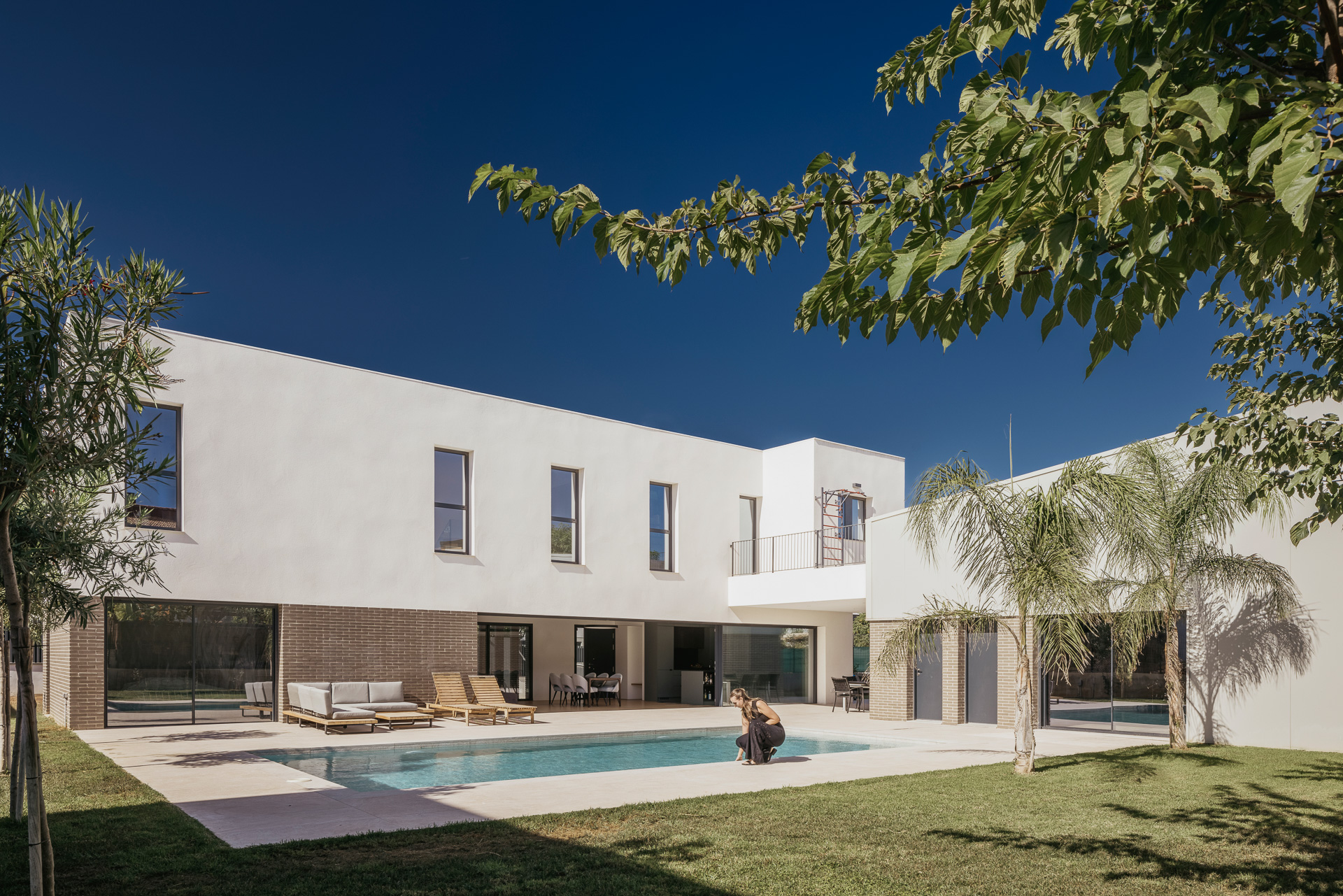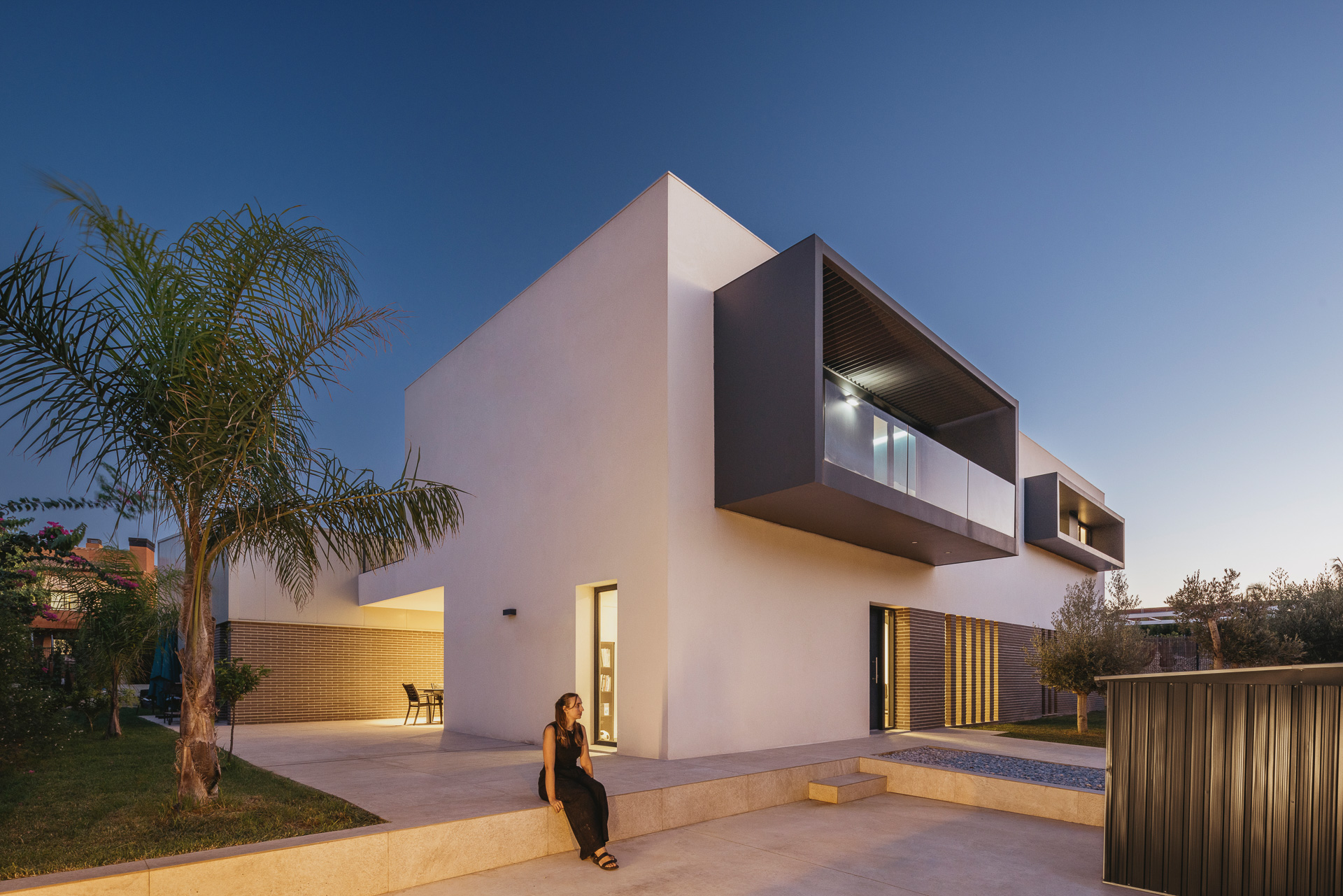 El proyecto se configura mediante dos volúmenes principales. El primero, de geometría rotunda y limpia, alberga el programa principal de la vivienda. En él, una franja de ladrillo visto gris abraza la planta baja aportando textura y privacidad mediante celosías, mientras que el resto de la fachada apuesta por la pureza del monocapa blanco. En la planta superior, dos cuerpos de aluminio gris antracita se proyectan hacia el exterior, subrayando los huecos que recaen a la calle.