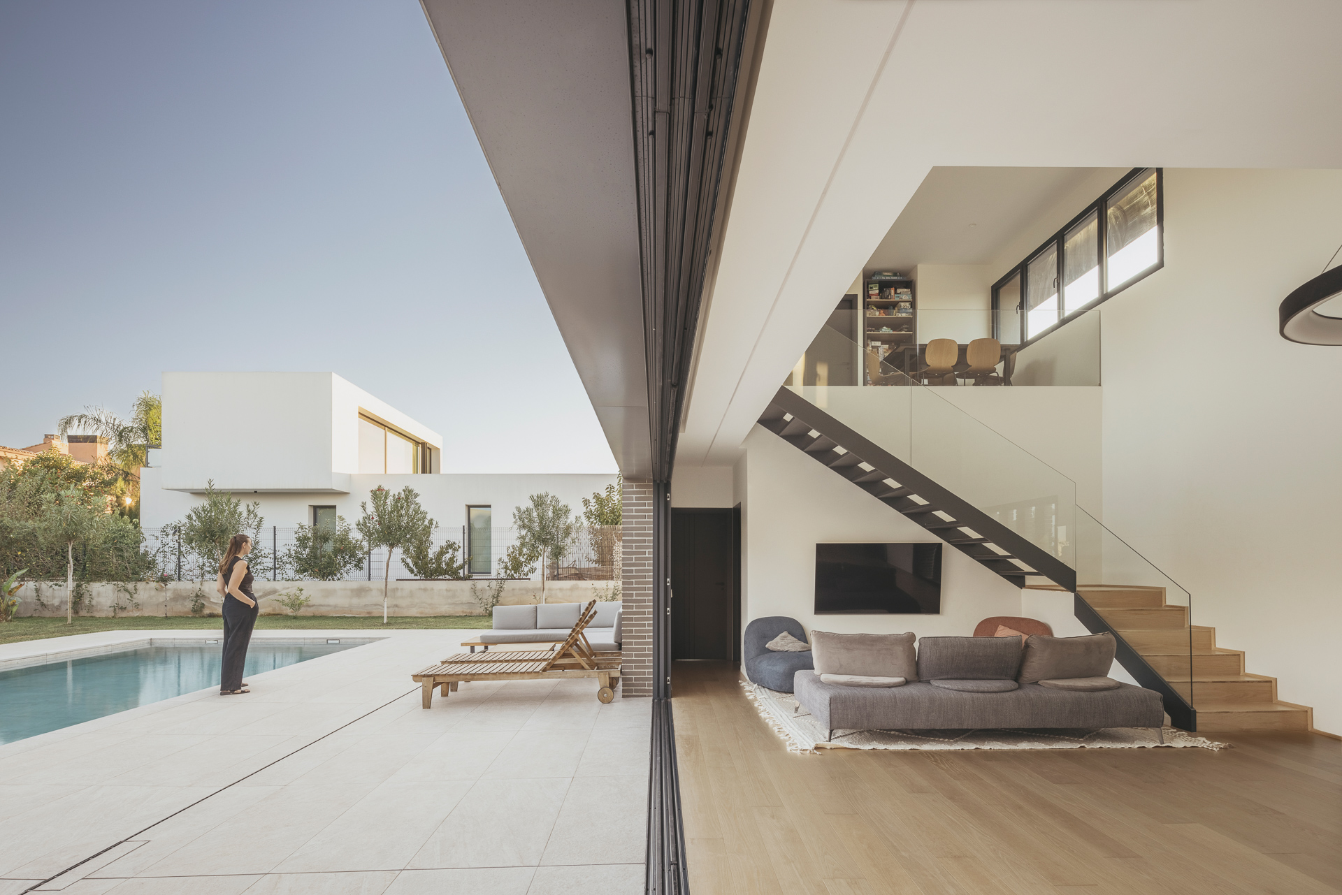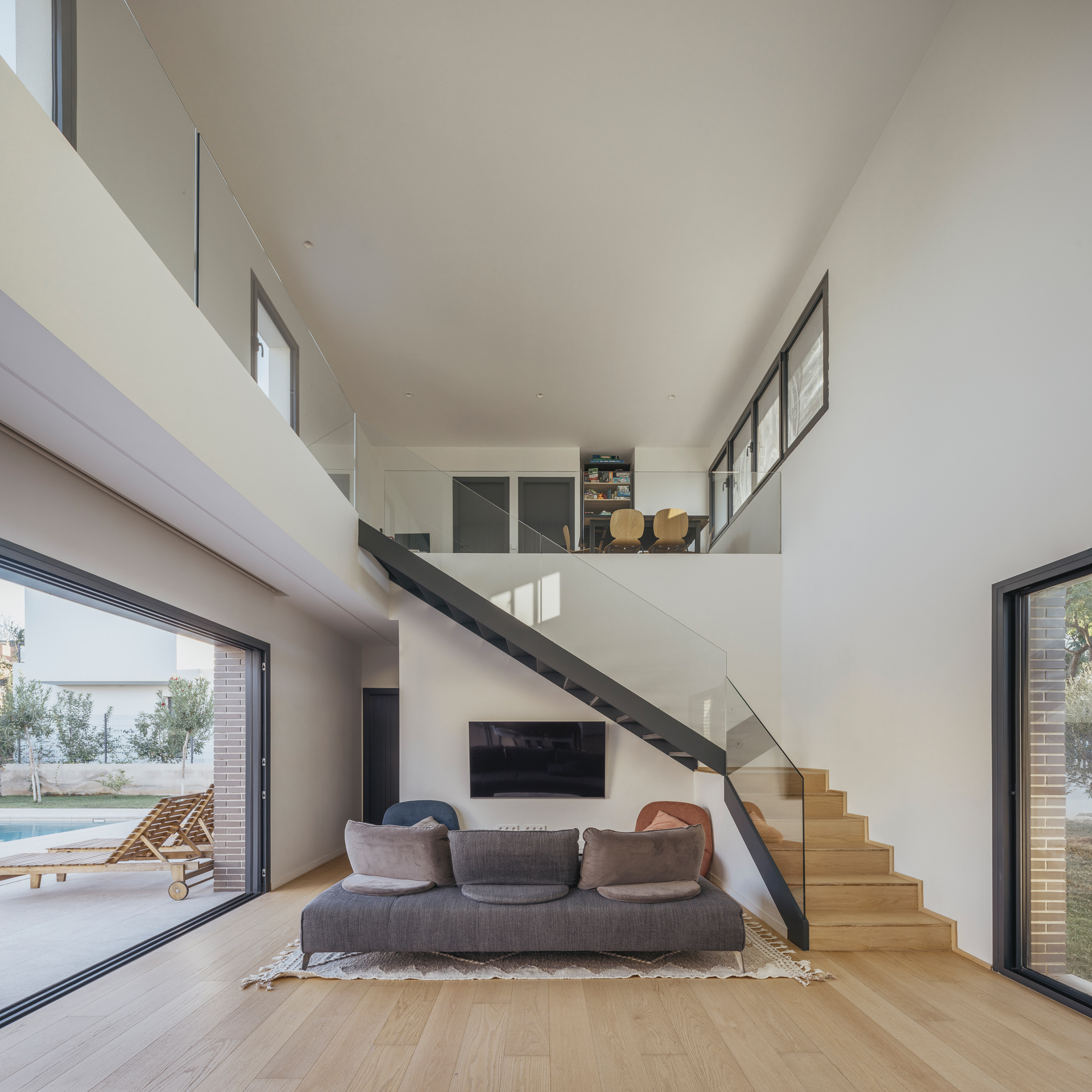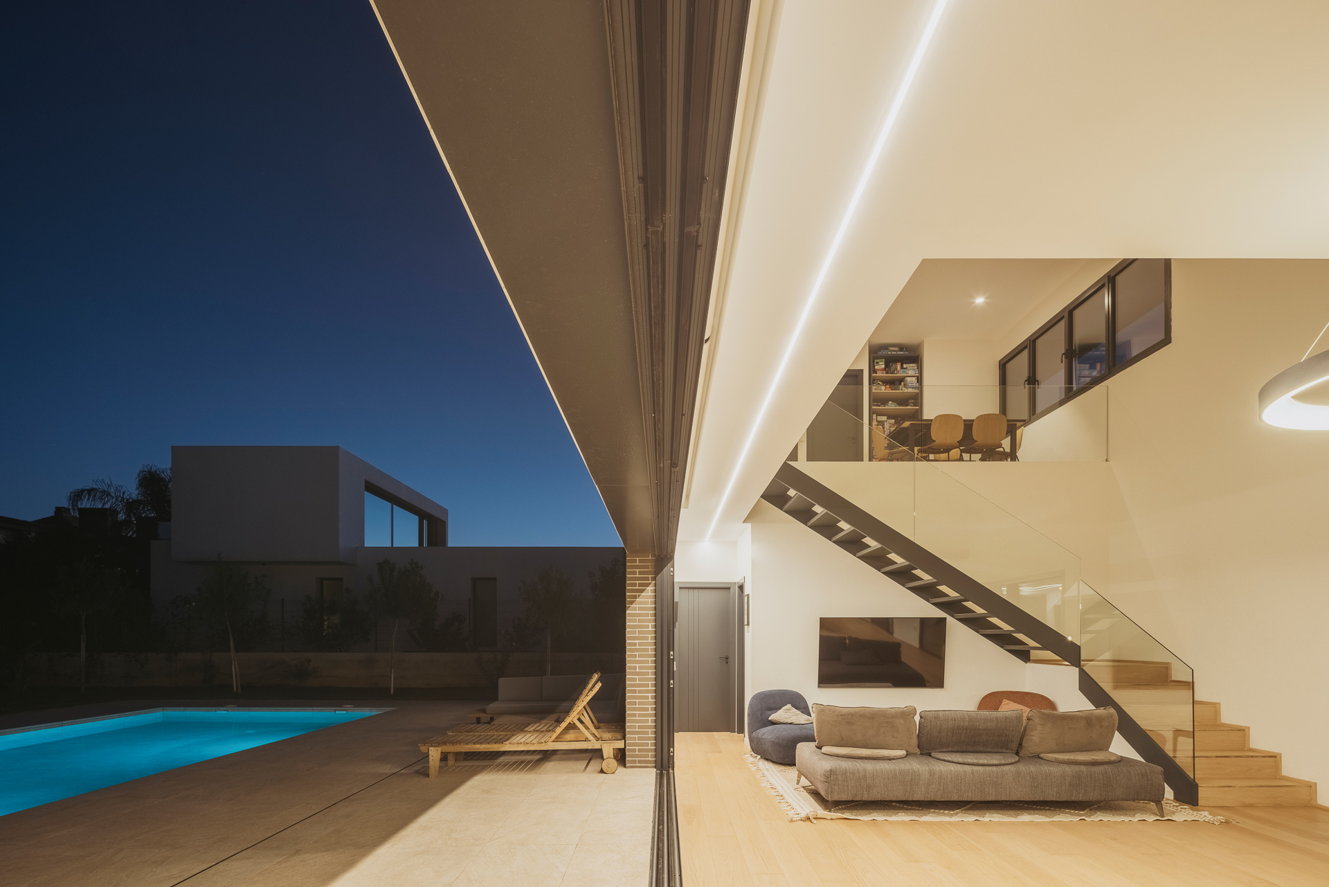 El corazón de la casa es un gran espacio diáfano de salón, comedor y cocina. Este núcleo se vuelca al jardin a través de un ventanal de 11 metros de longitud y conecta con la zona de juegos superior a través una doble altura. El resultado es una vivienda inundada de luz donde los límites entre el interior y el exterior terminan por diluirse.