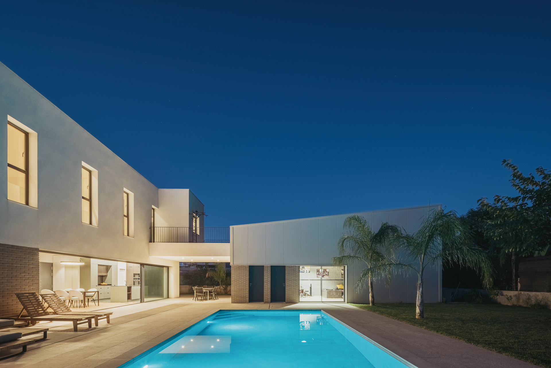 La planta baja se reserva para los usos de día, recayendo el salón hacia el patio y una terraza trasera y la cocina-comedor hacia el frente de calle, donde otra terraza cubierta y la piscina dominan el espacio.